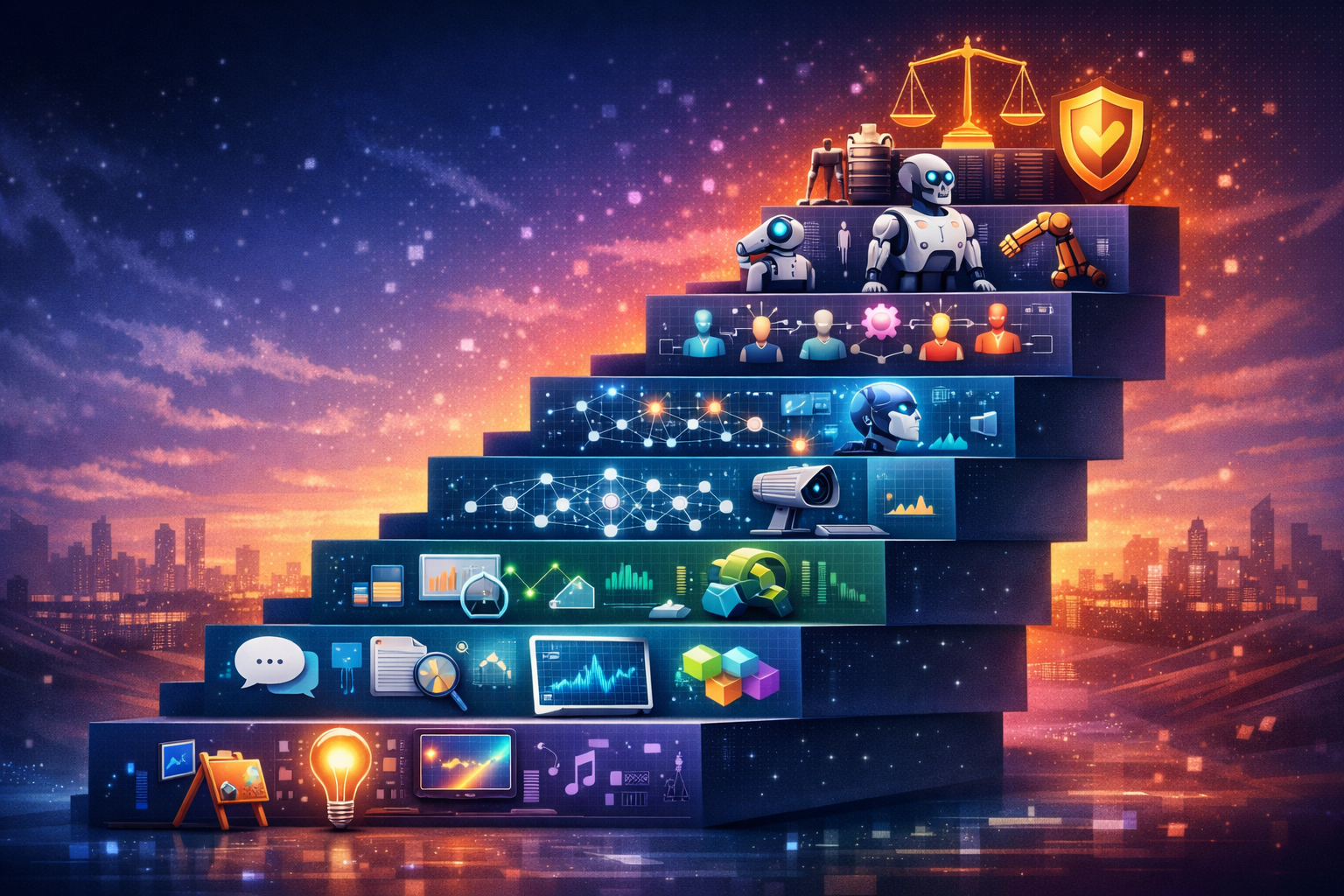 2 → NLP — dilin anatomiyası. Embedding, RAG pipeline, semantik axtarış. Şirkətlərin 70%-i hələ bu qatda ilişib.