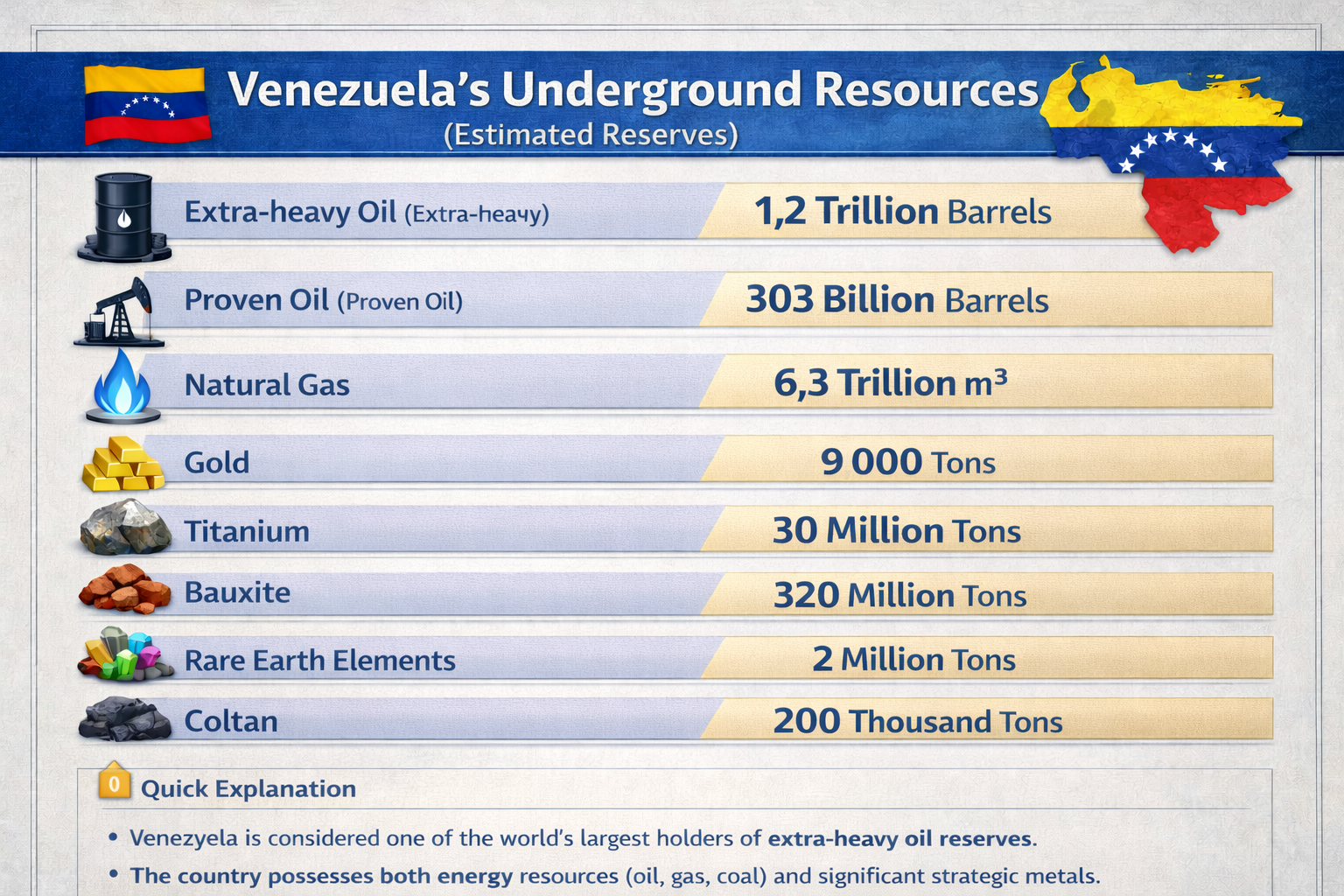 Venezuela is considered one of the richest countries in the world in terms of underground resources. The country has immense potential both in energy resources and in strategic metals. Various assessments show that Venezuela holds a significant position globally not only because of its oil reserves, but also due to its reserves of gold, bauxite, titanium, and rare earth elements.